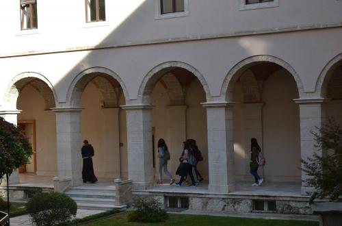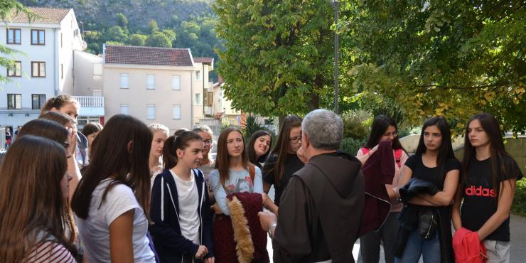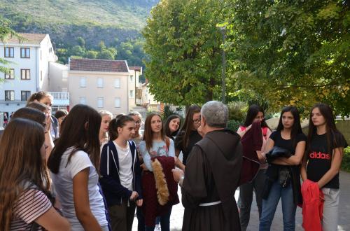 U subotu 14. listopada 2017. godine 30-ak framaša prvog razreda krenulo je na studijsko putovanje samostanima Hercegovačke franjevačke provincije. Pošli smo u 8.00 sati i uputili se u Tomislavgrad gdje nas je dočekao gvardijan samostana fra Sretan Ćurčić. Proveo nas je kroz samostansku crkvu i ukratko ispripovjedio njezinu povijest, a zatim smo posjetili lapidarij u samostanskom klaustru te novouređenu franjevačku knjižnicu i njihov poznati muzej, jedini s afričkom zbirkom u BiH. U crkvi smo vidjeli sliku "Isus prijatelj malenih" slikara Vlahe Bukovca koja je neprocjenjive vrijednosti i ogromnih dimenzija. Nakon Tomislavgrada krenuli smo prema Konjicu. Tu smo posjetili crkvu i muzej i čuli iz usta gvardijana fra Ferde Bobana svjedočanstvo u sve malobrojnijoj katoličkoj zajednici u konjičkom kraju. Poslije toga smo krenuli prema Mostaru. Ručali smo u Dompesu, novootvorenom franjevačkom kompleksu pučke kuhinje i studentskog doma u Mostaru, nakon čega smo obišli crkvu čiji je dovršetak izgradnje u tijeku, potom vidjeli spomen-sobu stare mostarske crkve srušene u Domovinskom ratu i franjevačku knjižnicu pa se popeli na zvonik. Samostanskim nas je kompleksom proveo, uz iscrpno tumačenje povijesnih događaja, provincijski knjižničar fra Ante Marić. Nakon posjeta samostanu prošetali smo do starog mosta. Iz Mostara smo pošli na Široki Brijeg gdje nam je fra Ivan govorio o izgradnji crkve, odveo nas na mjesto smrti dvanaestorice franjevaca i opisao kako su ubijeni. Pokazao nam je jedini kip svetog Franje koji je izradila žena i brojna druga umjetnička djela koja se nalaze u samostanskoj riznici i Franjevačkoj galeriji na Širokom Brijegu. Vidjeli smo, naravno, velebnu širokobriješku crkvu koja čuva mučeničke kosti i kosti fra Didaka Buntića, graditelja crkve te kosti biskupa fra Rafe Barišića, prvoga hercegovačkog biskupa u XIX. st. Posljednji samostan koji smo posjetili je onaj na Humcu. Tu smo susreli fra Antu Mitra, fra Antu Begića i fra Željka Tomića iz Posušja koji se, uz još dvojicu mladića, nalaze u Franjevačkom novicijatu na godini kušnje. Oni su nas proveli kroz prelijepo novicijatsko dvorište, a potom nam je gvardija fra Dario Dodig pokazao staru humačku crkvu, jedinu u Hercegovini koja potječe iz turskog vremena. Vidjeli smo zatim i zanimljivu galeriju križeva, galeriju "Majka" s različitim motivima žene i majke te muzej gdje se, među brojnim arheološkim eksponatima, u najznačajnije ubraja Humačka ploča, ranosrednjovjekovna darovnica. S Humca smo se uz pjesmu vratili u Posušje, oko 21 sat.