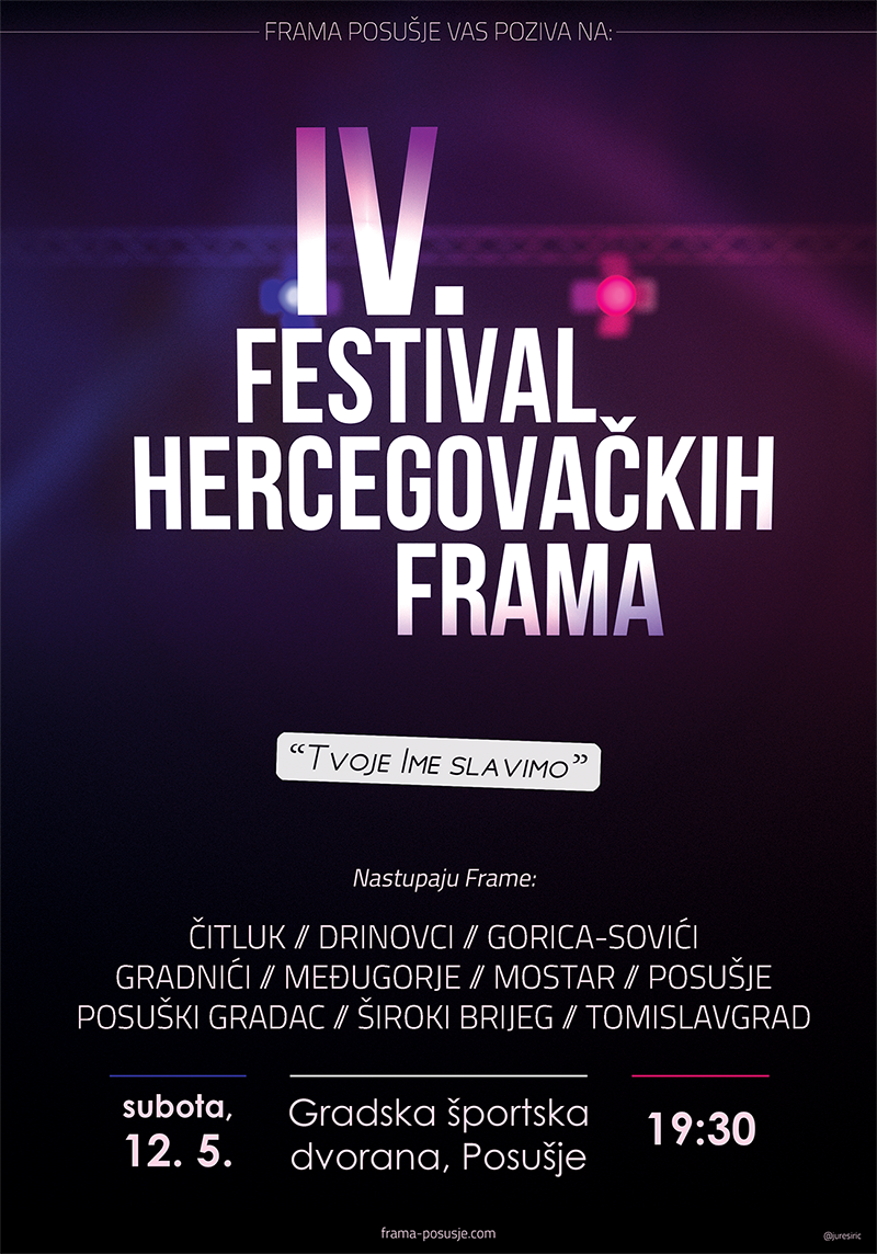 U subotu 12. svibnja 2018. u 19.30h u Gradskoj športskoj dvorani u Posušju proslavit će se IV. Festival hercegovačkih Frama. Na ovom će revijalnom Festivalu ove godine nastupiti 10 Frama iz Hercegovine: Čitluk, Drinovci, Gorica-Sovići, Gradnići, Međugorje, Mostar, Posušje, Posuški Gradac, Široki Brijeg, Tomislavgrad te gost iznenađenja. Festival počinje slavljem sv. mise za sve izvođače u kripti nove posuške župne crkve u 18 sati, a završava zajedničkim domjenkom i druženjem u maloj Gradskoj športskoj dvorani.