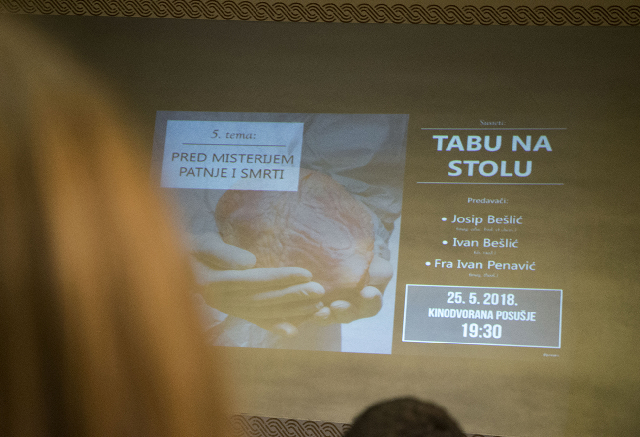 U petak 25. svibnja 2018. s početkom u 19.30 sati u kinodvorani u Posušju održan je peti i ujedno posljednji susret iz ciklusa "Tabu na stolu" na temu "Pred misterijem patnje i smrti".