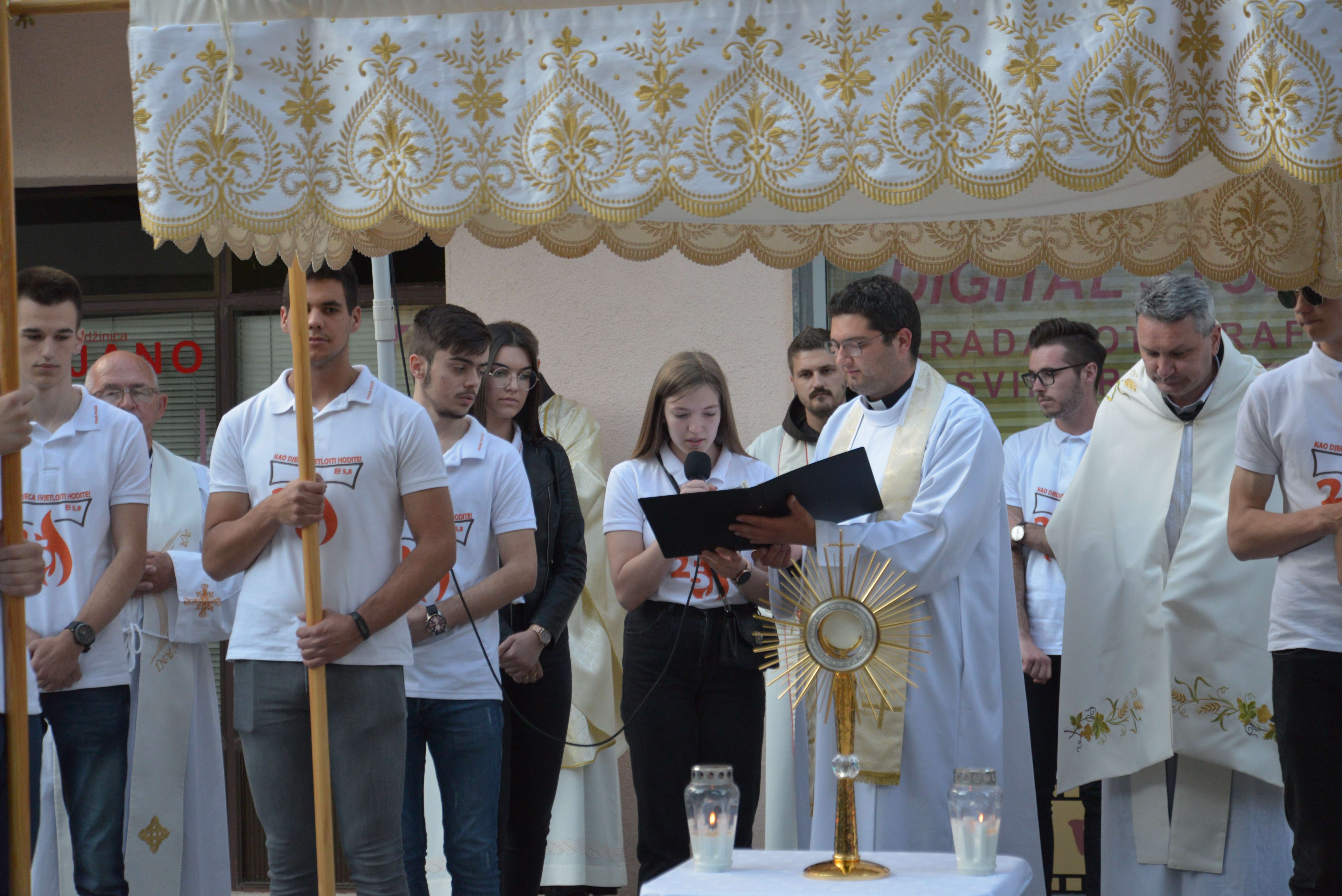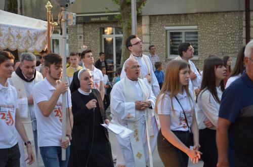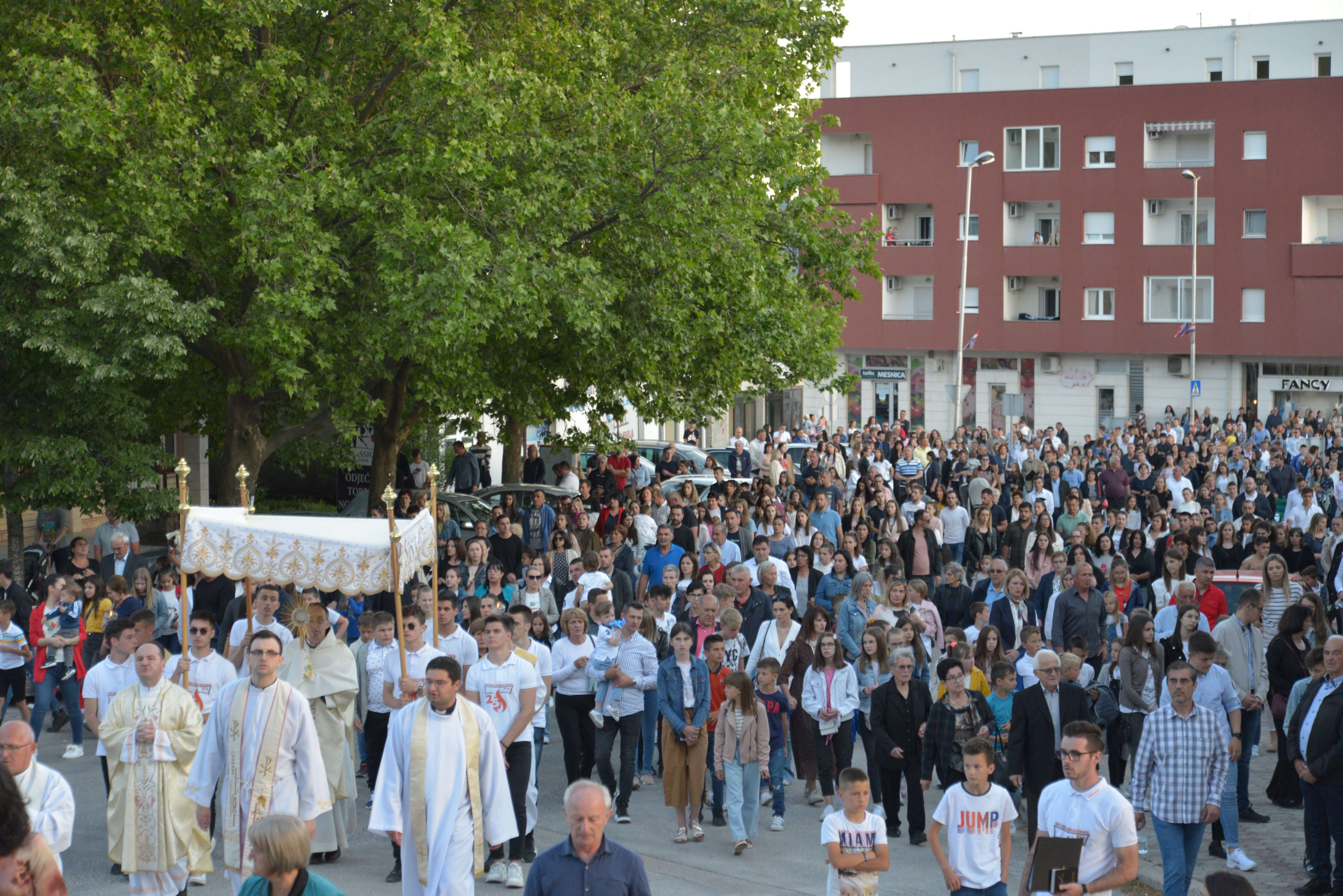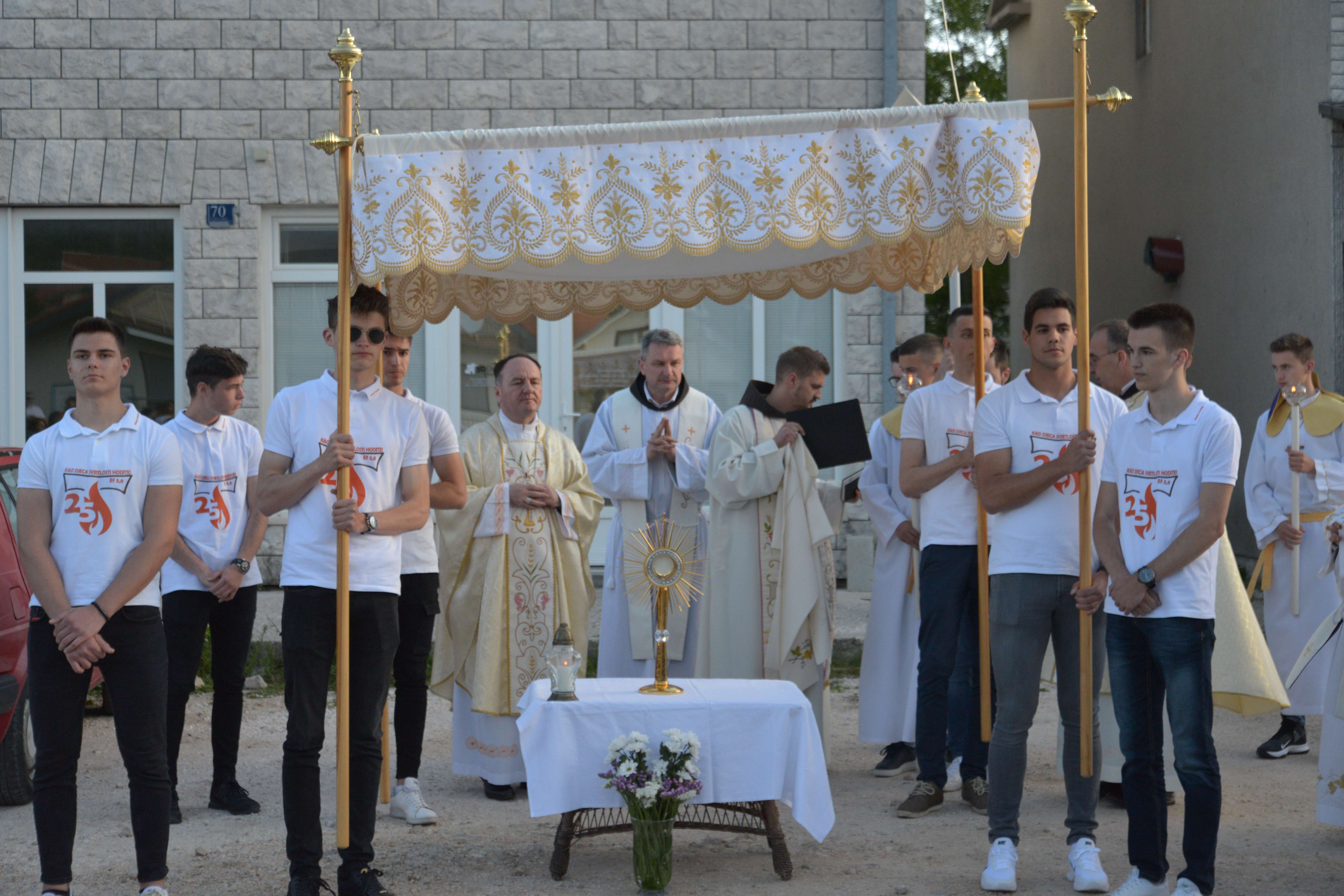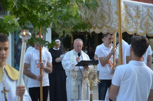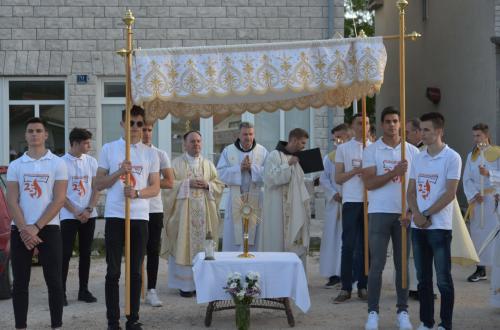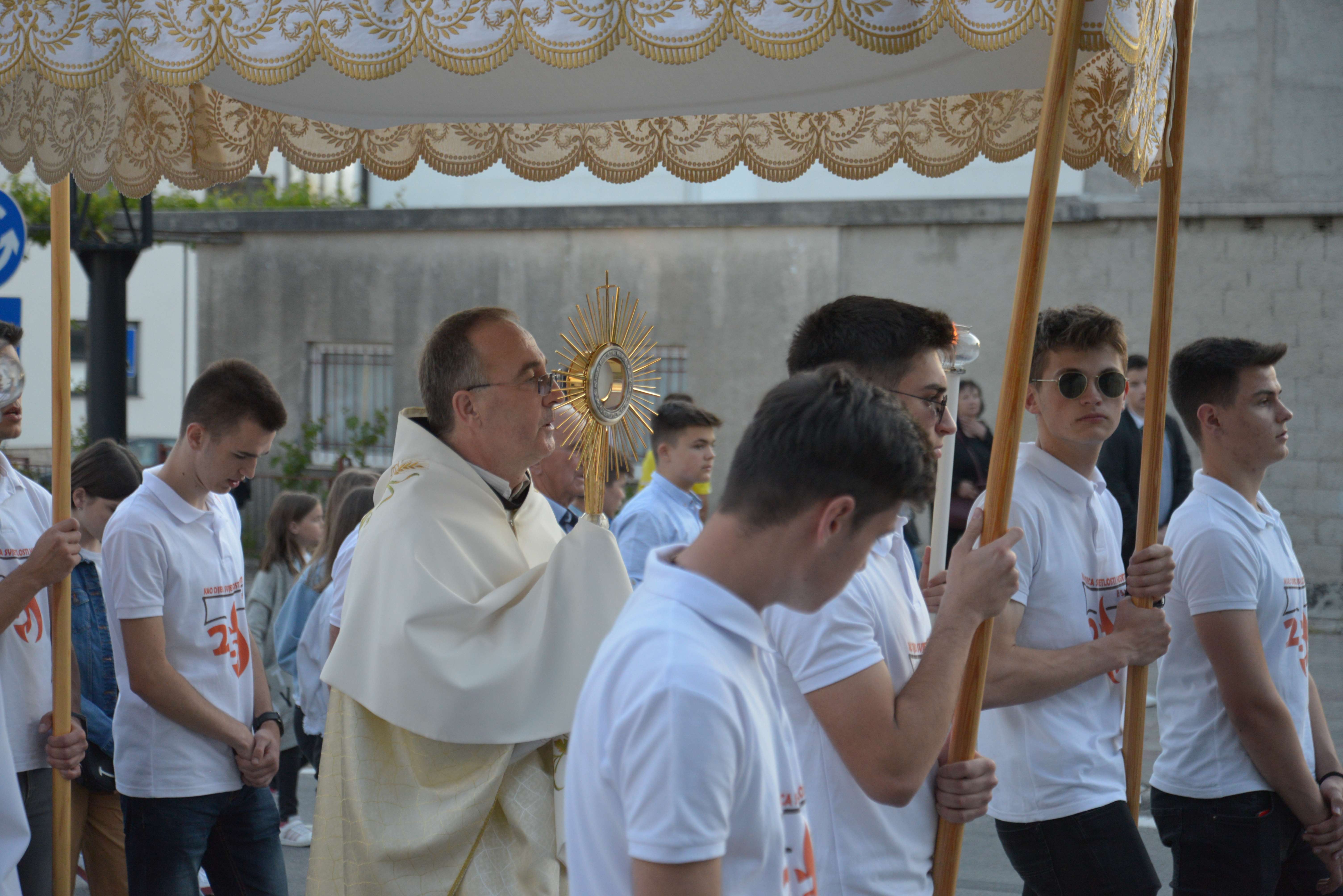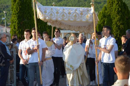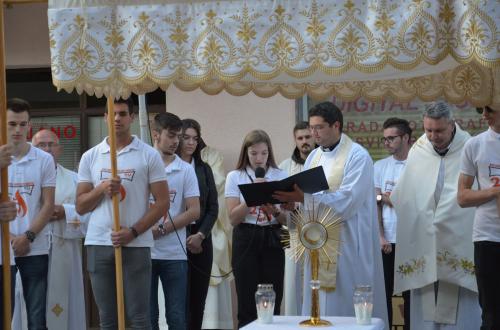 Nakon Euharistije, svečana procesija je s Presvetim krenula ulicama našega grada. Slavili smo Gospoda molitvom, pjesmom i čitanjima. Procesija se također sastojala od četiri postaje koje su tematski određene i koje odražavaju određene dijelove Euharistije. Na prvoj smo postaji slušali Ivanovo Evanđelje gdje Bog govori: „Kruh koji ću ja dati tijelo je moje – za život svijeta“ , što nam potvrđuje Kristovu trajnu prisutnost i Euharistijsku žrtvu. Druga postaja nam donosi Lukino evanđelje u kojem Kristovom zahvalom i blagoslovom kruh i vino postaju pravo Tijelo i Krv Kristova. Upravo nas je Isus predavanjem Tijela i prolijevanjem Krvi u potpunosti otkupio te nam svakodnevno daje priliku da ga ponovno primimo. Na trećoj i četvrtoj postaji smo slušali dio iz prve poslanice Korinćanima gdje nam Isus daruje sebe kao dar ljubavi i traži da ga primimo u ljubavi i čistoći srca te da zajedno budemo jedno tijelo, jedno srce i jedna duša međusobno povezani upravo Njim.