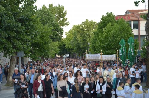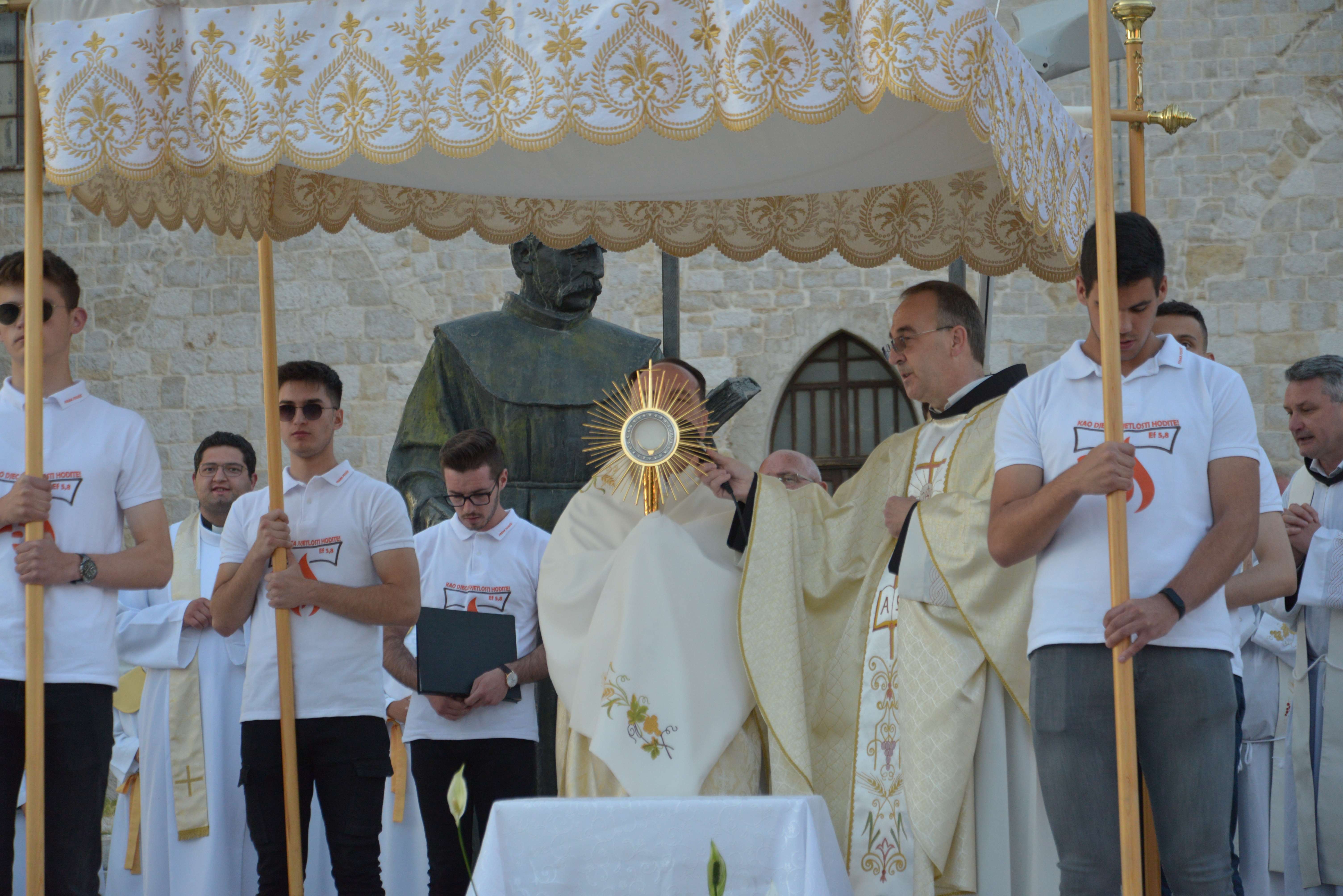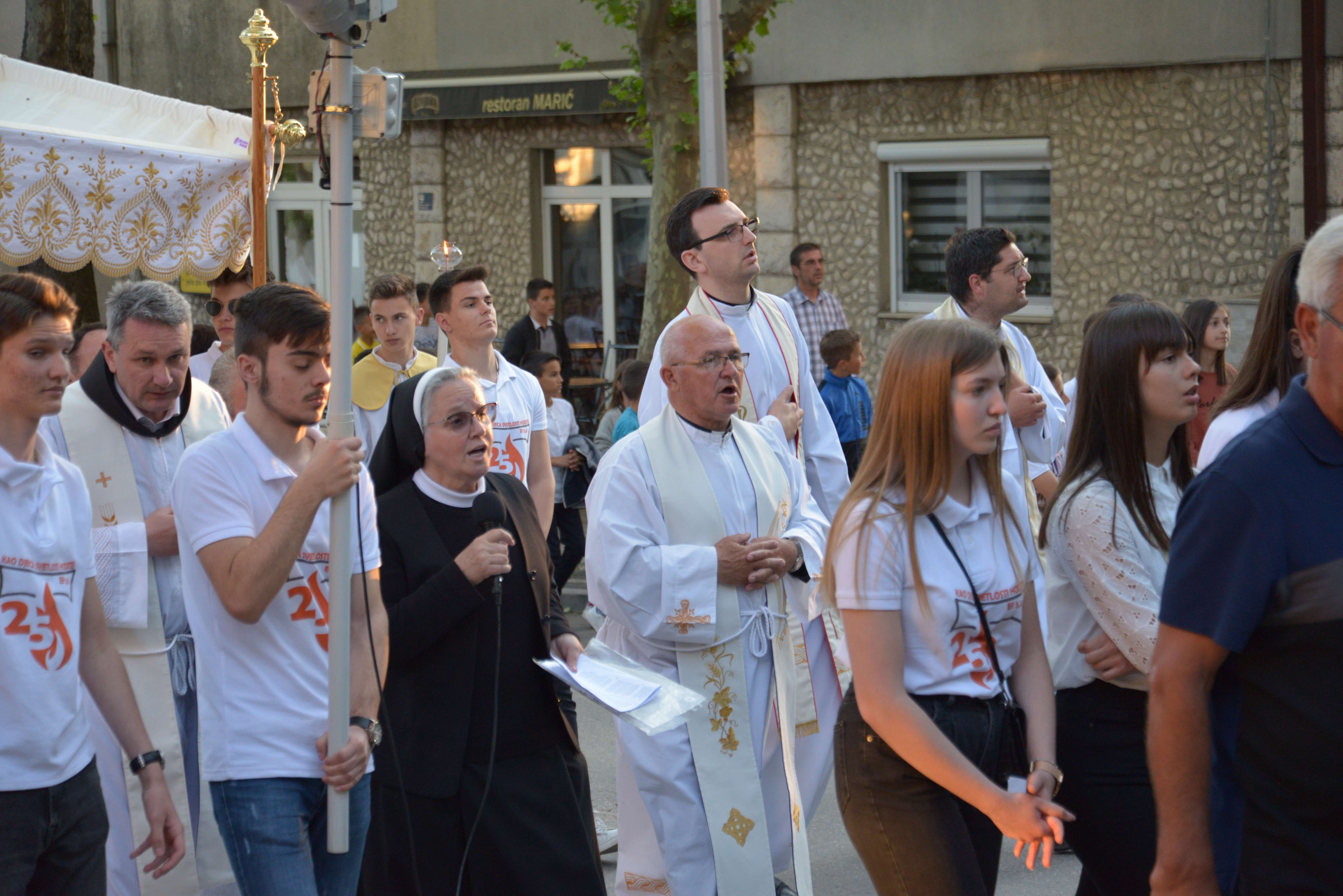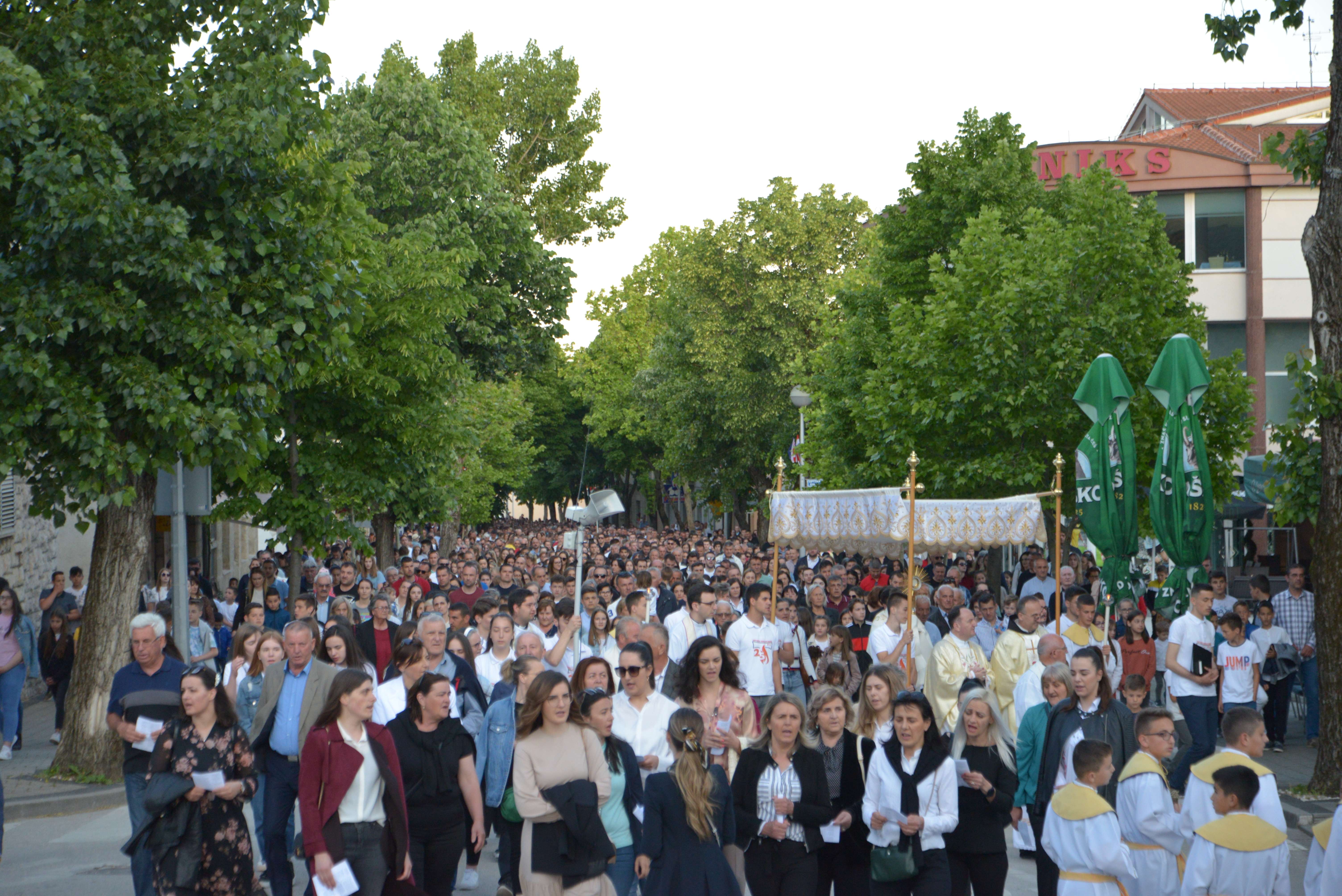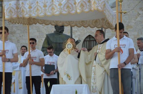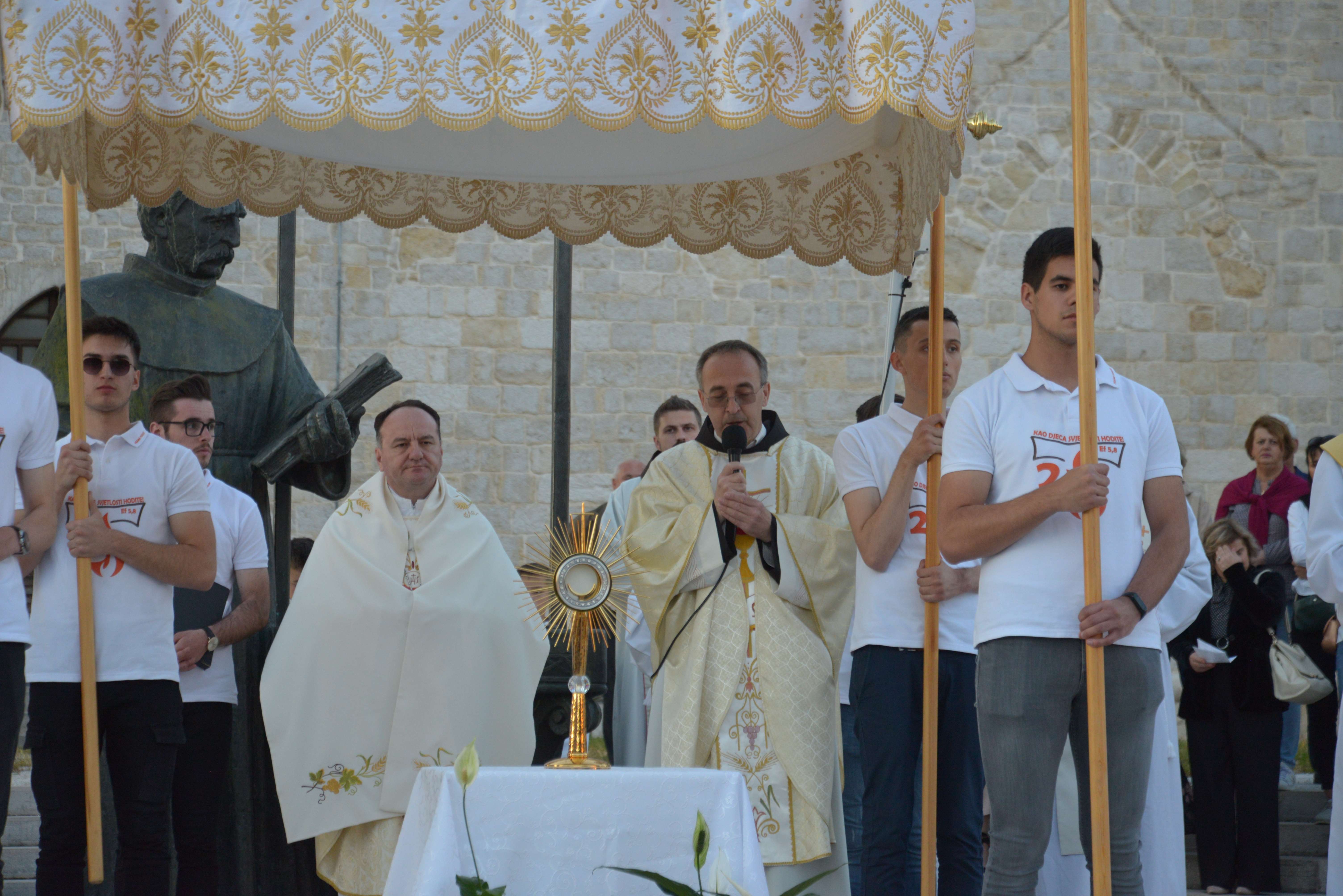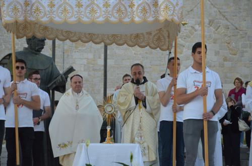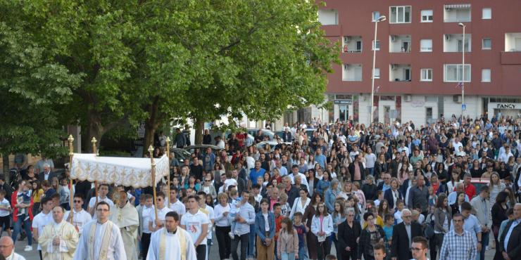 Nakon Euharistije, svečana procesija je s Presvetim krenula ulicama našega grada. Slavili smo Gospoda molitvom, pjesmom i čitanjima. Procesija se također sastojala od četiri postaje koje su tematski određene i koje odražavaju određene dijelove Euharistije. Na prvoj smo postaji slušali Ivanovo Evanđelje gdje Bog govori: „Kruh koji ću ja dati tijelo je moje – za život svijeta“ , što nam potvrđuje Kristovu trajnu prisutnost i Euharistijsku žrtvu. Druga postaja nam donosi Lukino evanđelje u kojem Kristovom zahvalom i blagoslovom kruh i vino postaju pravo Tijelo i Krv Kristova. Upravo nas je Isus predavanjem Tijela i prolijevanjem Krvi u potpunosti otkupio te nam svakodnevno daje priliku da ga ponovno primimo. Na trećoj i četvrtoj postaji smo slušali dio iz prve poslanice Korinćanima gdje nam Isus daruje sebe kao dar ljubavi i traži da ga primimo u ljubavi i čistoći srca te da zajedno budemo jedno tijelo, jedno srce i jedna duša međusobno povezani upravo Njim.